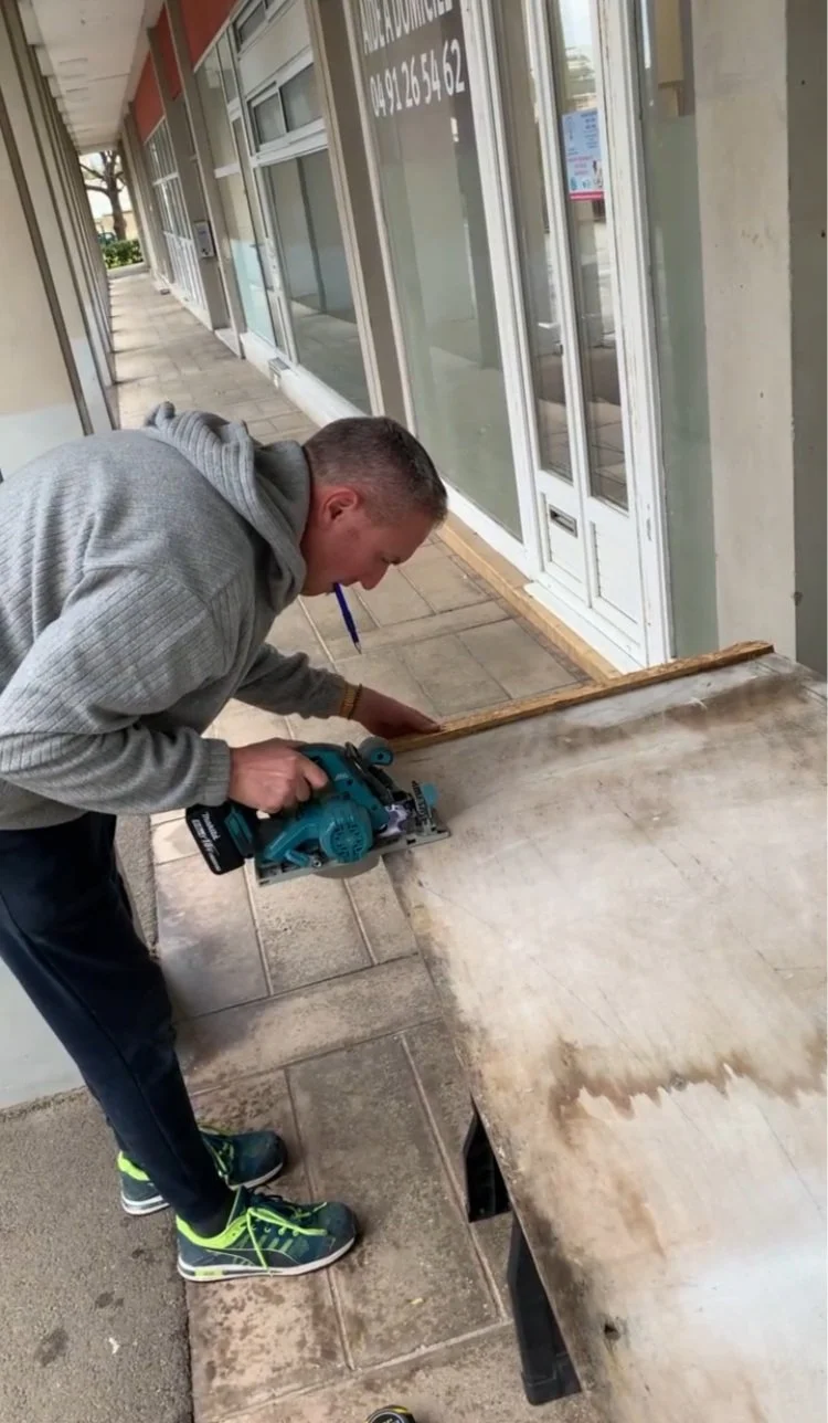 Arrivée sur place de Nicolas et Glen à 16h pour la pose temporaire d’une porte en bois, le temps de fabriquer la porte en verre.
