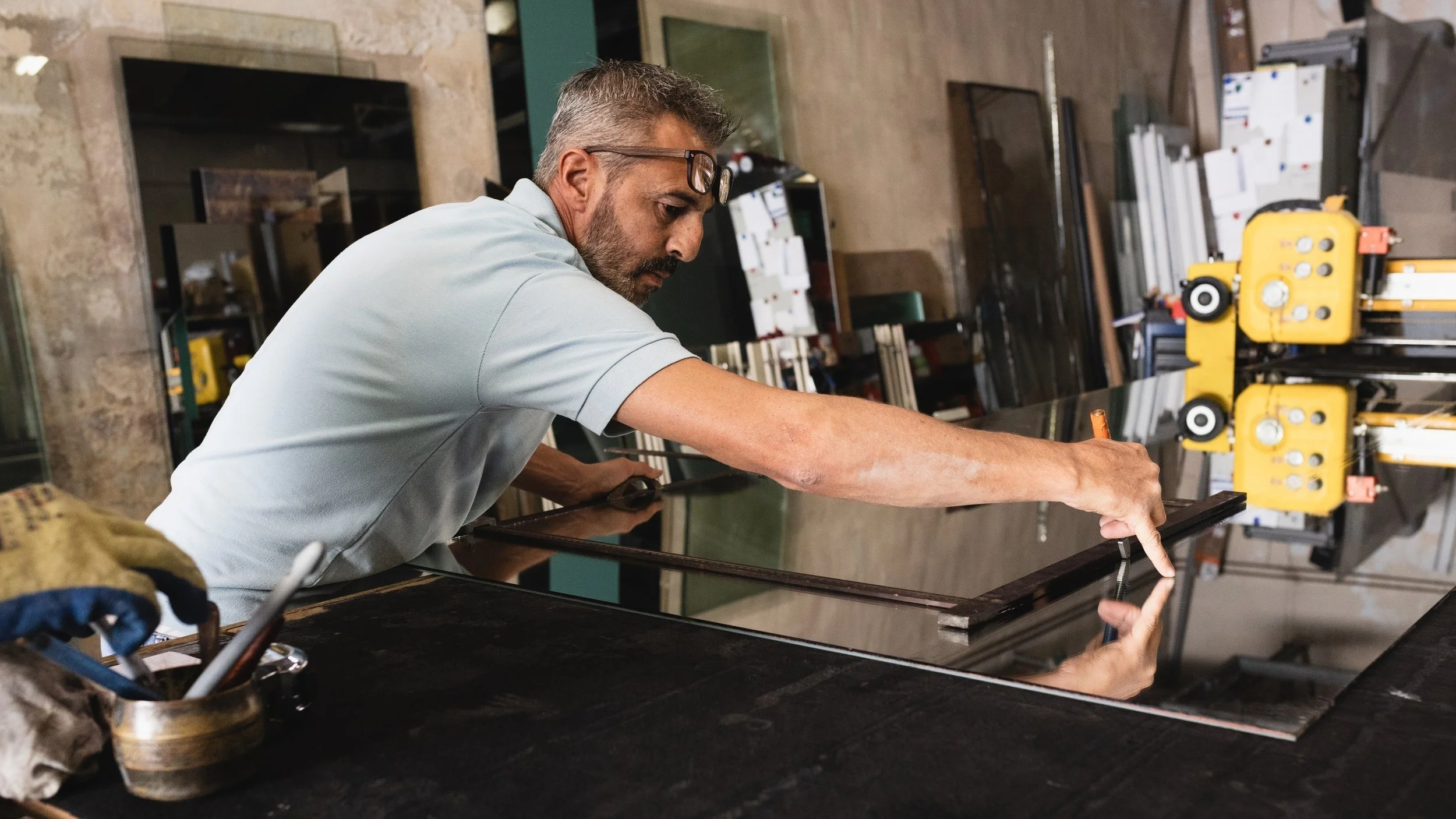 Une fois les côtes prises, nous nous sommes redirigés vers l’atelier afin de façonner les protège-bureaux: c’est maintenant que le métier de miroitier prend tout son sens. Denis, notre miroitier vitrier de renom, commence les coupes.