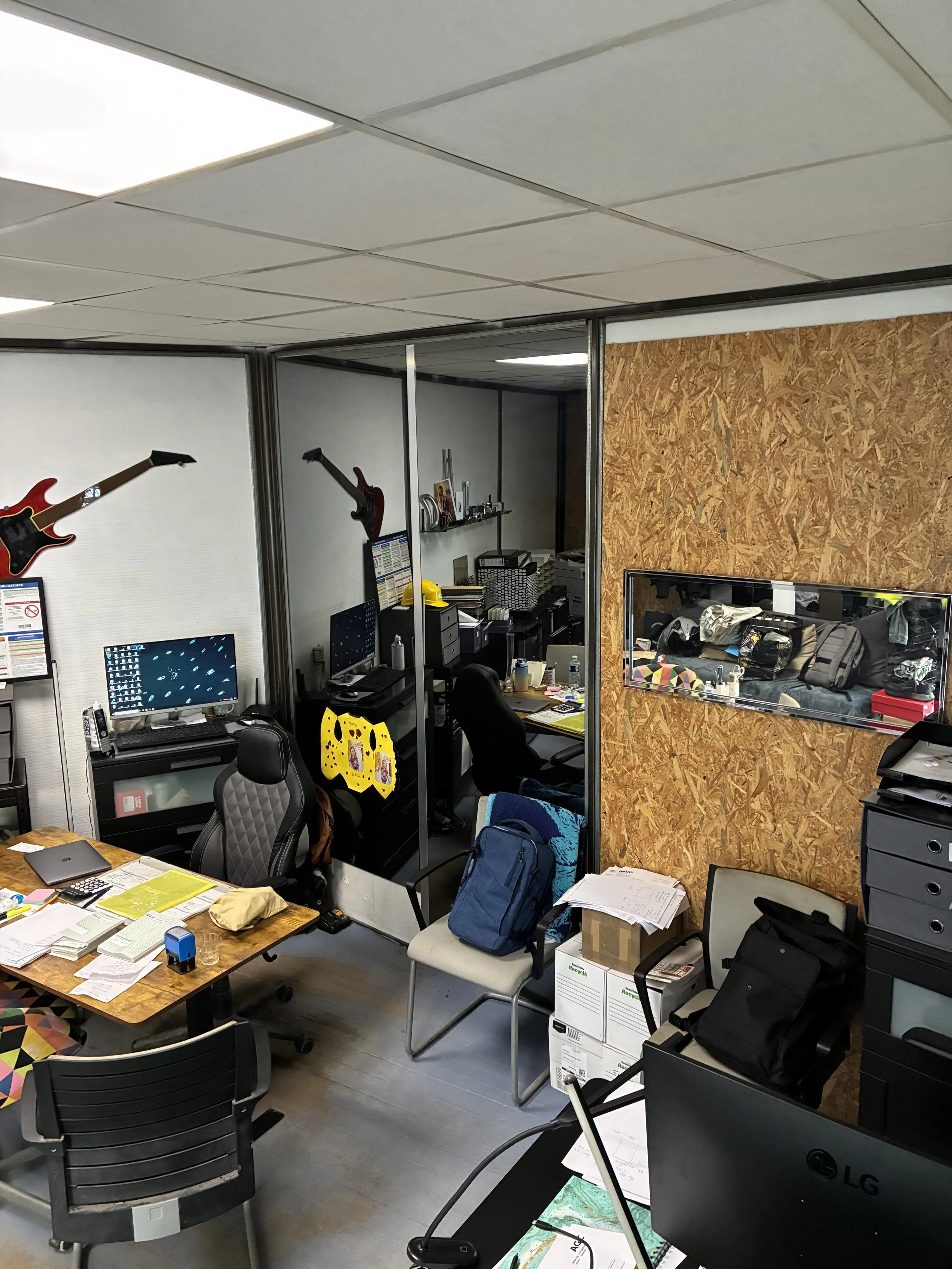 Partie bureaux (3 existants) avec rangements respectifs, 1 imprimante, 2 commodes.